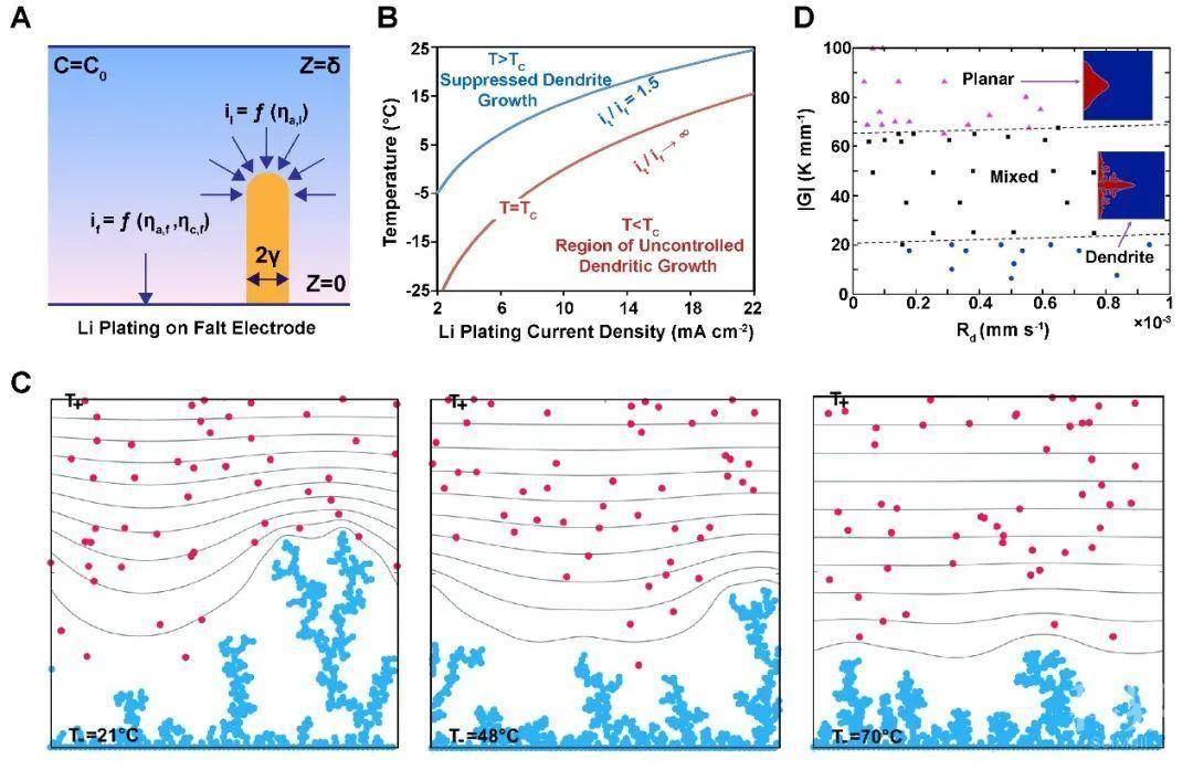 1、锂枝晶生长的热力学能量因素及模型锂的电化学沉积与化学反应、电荷转移、物质传输和结晶等过程有关,这些过程由锂离子的表面扩散和界面SEI膜的性质决定。其中,决定离子吸附/解吸能量的异质性的热力学能量因素源于电极表面的不等价表面和迁移能反应位点。比如Matsui认为锂之所以更容易形成枝晶,是因为Li原子之间的键合较弱,因此Li+从体相移动到表面所需的能量较少,而低的自由能差意味着在系统中更趋向于形成如晶须和枝晶的低维结构。Ely等人则通过整合热力学和动力学原理提出:电沉积过程中,枝晶的形成需要达到热力学临界半径,而后续生长则需要达到动力学临界半径。根据这个模型,Aniruddha等人提出了一种使用Gibbs-Duhem方程的热力学一致的生长理论,证明了高界面能和低Gibbs转化自由能可以通过在热力学抑制机制中选择合适的过电势和负极粒径来延迟枝晶生长甚至避免枝晶的生长。此外,Wang等人从表面能的角度探究了枝晶生长过程,他们将基底的表面能视为沉积膜的表面能和负电势能的结合,基底表面在沉积发生前是稳定的,但在沉积/剥离过程中,在电场的作用下,局部集中的锂沉积导致了枝晶的形成和积累,引发大的枝晶表面能,从而导致枝晶的进一步生长。因此,循环会带来更粗糙的基底表面和更低的库伦效率。根据这些模型可以发现,通过调节系统的组成和锂金属负极的形貌加上控制过电势来调控表面能可能是一种抑制锂枝晶的有效策略。2、温度效应相关模型
