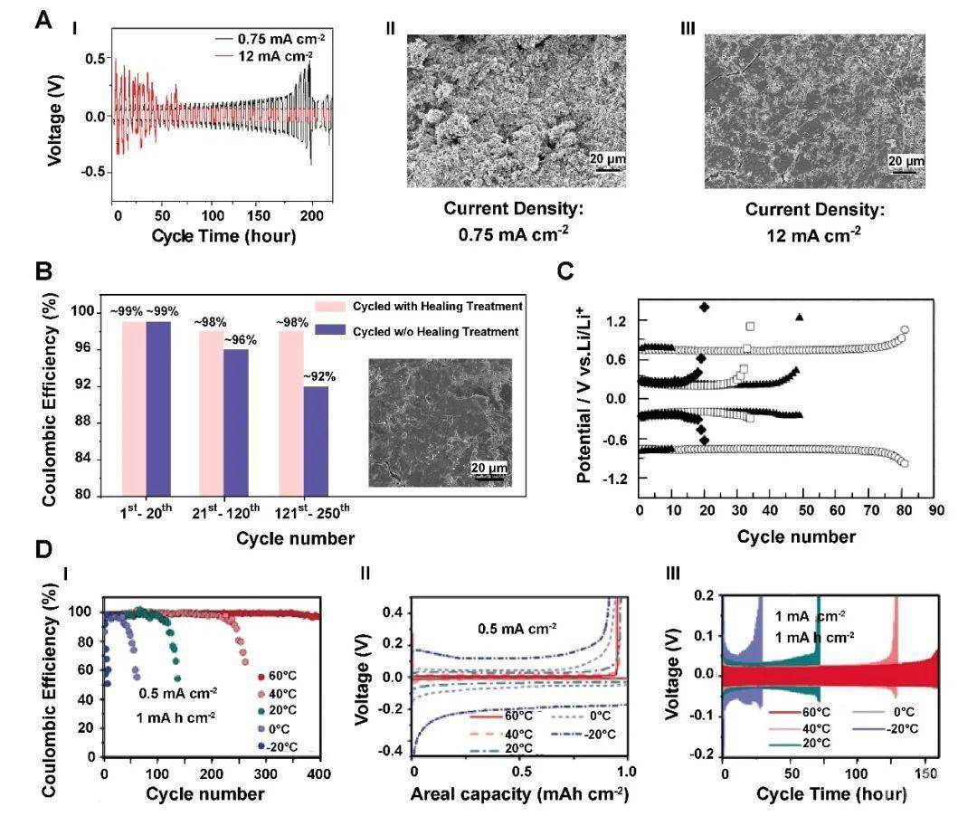 图 5 无枝晶锂金属负极的设计策略从热力学角度来看,热是平滑锂沉积的另一种解决思路。基于上述成核模型,Koratkar提出了高电流密度下控制电化学沉积的枝晶自愈合策略。高电流密度引起电化学过电势增加,导致了成核半径变小、成核速率加快、成核密度增加。因此,经过枝晶的电流能产生足够的焦耳热来促进锂原子从枝晶尖端迁移到相邻枝晶间的凹谷区域,广泛的扩散从而使枝晶光滑。这一自愈合的概念通过不同电流密度下的锂锂对称电池可以验证,在12 mA cm-2的高电流密度下可以观察到无枝晶且光滑的锂沉积(图 5A)。而且用正常的电流密度循环,同时伴随反复的高电流密度愈合处理的电池同样表现出更好的循环性能和高库伦效率,以及低热失控风险。该策略同样在锂硫电池中得到了验证,电池在愈合处理后表现出更优异的电化学性能(图 5B)。Hong等人进一步提出了一种热耦合的相场模型,结合能量平衡方程来充分解释其愈合机理,提供了两个参数来区分枝晶的自热和生长的影响:锂电化学反应势垒和扩散势垒。当电化学反应势垒小于扩散势垒时,自热将大大增加离子传输并降低枝晶生长速率。相反,电化学反应势垒较大时,反应速率的增加超过离子迁移的增加,从而导致增加的枝晶生长速率。结合结构负极设计和枝晶自愈合的协同效应可以成为改变锂沉积行为的有效策略。(2)电极/电解质界面工程锂与液体电解质接触时的热力学本征不稳定特性导致了电极/电解质界面处SEI的形成,易破裂的SEI引发了循环时电解质分解和进一步的枝晶生长。因此,电极/电解质的界面改性是一种有效策略。而温度是决定电解质和SEI的性质的重要因素,因此控制温度可以改变电极/电解质的界面性质。Ishikawa等人在LiPF6–PC/DMC电解液中,于- 20 ℃下在镍基底上预循环锂金属,在25 ℃下实现了稳定的低电阻LiF界面层,从而提升了锂负极的循环性能(图 5C)。有效低温预循环效应为未来低温下电解质中溶剂化行为和SEI界面上去溶剂化行为提供了方向,以便针对特定应用优化低温下的电化学性能。Wang等人则通过将温度提升到60 ℃,在醚类电解液中实现了相比室温(20 ℃)更好的电化学效应(图 5D)。如上所述,高温下(60 ℃)沉积的低表面积锂颗粒减少了锂与电解质之间的接触,降低了副反应的发生。在60 ℃下,醚基电解质中形成的SEI表现出机械稳固且有序的多层结构,从而有效钝化负极,实现较少的不可逆锂损失和较高的库伦效率。但是,升高温度并不是一定有利于锂沉积,相反,在一些不含添加剂的碳酸酯基电解质中观察到了较高温度下具有较厚SEI层的不均匀锂枝晶。稳定电极/电解质界面的另一种直接策略是开发具有特定表面能的功能薄膜和人造SEI。锂表面的LiF/Cu基混合导体中间相保护层拥有高表面能以促进均匀的锂分布,并具有高的离子电导率以促进离子扩散以及高的杨氏模量以抑制枝晶生长。