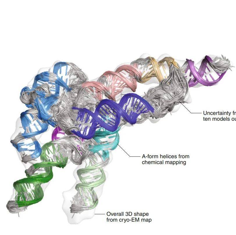 许多RNA分子可以折叠成复杂的三维结构,并具备基本的生物功能,包括调节基因的表达,感知小分子和催化反应的进行。这些生物学功能的实现往往不需要其他蛋白的帮助【1,2】。人类基因组的80%会被转录为RNA,而只有1.5%编码了蛋白质【3,4】。Protein Data Bank里面只有不到1500个RNA结构,而蛋白结构约有147000个。对RNA结构的了解可以增加我们对RNA序列-功能关系的理解,辅助功能性RNA分子的设计。然而,RNA分子构象的异质性太大,特别是在缺乏蛋白因子的情况下,传统技术如X射线晶体学和核磁共振难以用于确定RNA的结构。单颗粒冷冻电镜的发展使人们可以确定大分子量的蛋白质-RNA复合体的结构。但是,不包含蛋白质的RNA分子通常太小,且构象不均一,难以使用单颗粒冷冻电镜来分析它们的结构。迄今为止,冷冻电镜只解析了一个无蛋白RNA分子的结构:分辨率为9 Å的HIV-1的dimerization initiation signal(DIS),而且还需要核磁共振的辅助【5】。