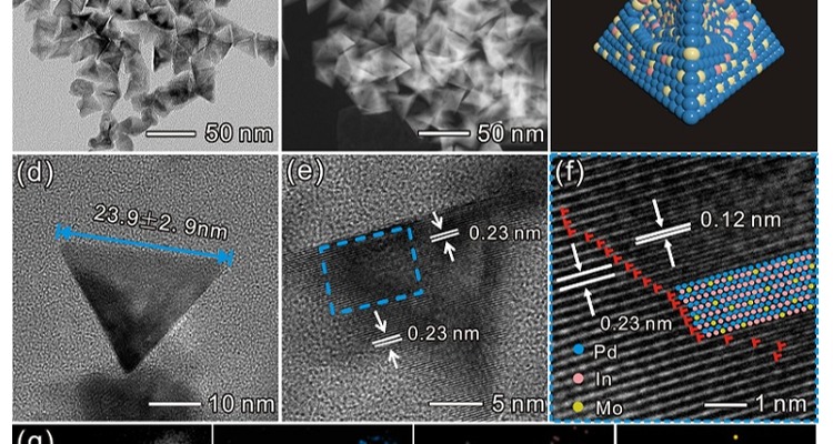 初始的Pd纳米为六角纳米盘形状,厚度小于2 nm,具有丰富的表面缺陷(如位错、台阶、晶界、无定型堆积)。在-0.7 V的电位下电解3000秒之后,纳米片发生严重的折皱和卷曲,高分辨暗场透射电子显微镜成像显示,其表面暴露大量的(100)晶面。这种由初始的(111)晶面向(100)晶面转变的现象同样发生在20 nm和120 nm的Pd纳米片上。CO析出曲线也可以清晰的表明反应前后主要暴露晶面的差异(图1f)。