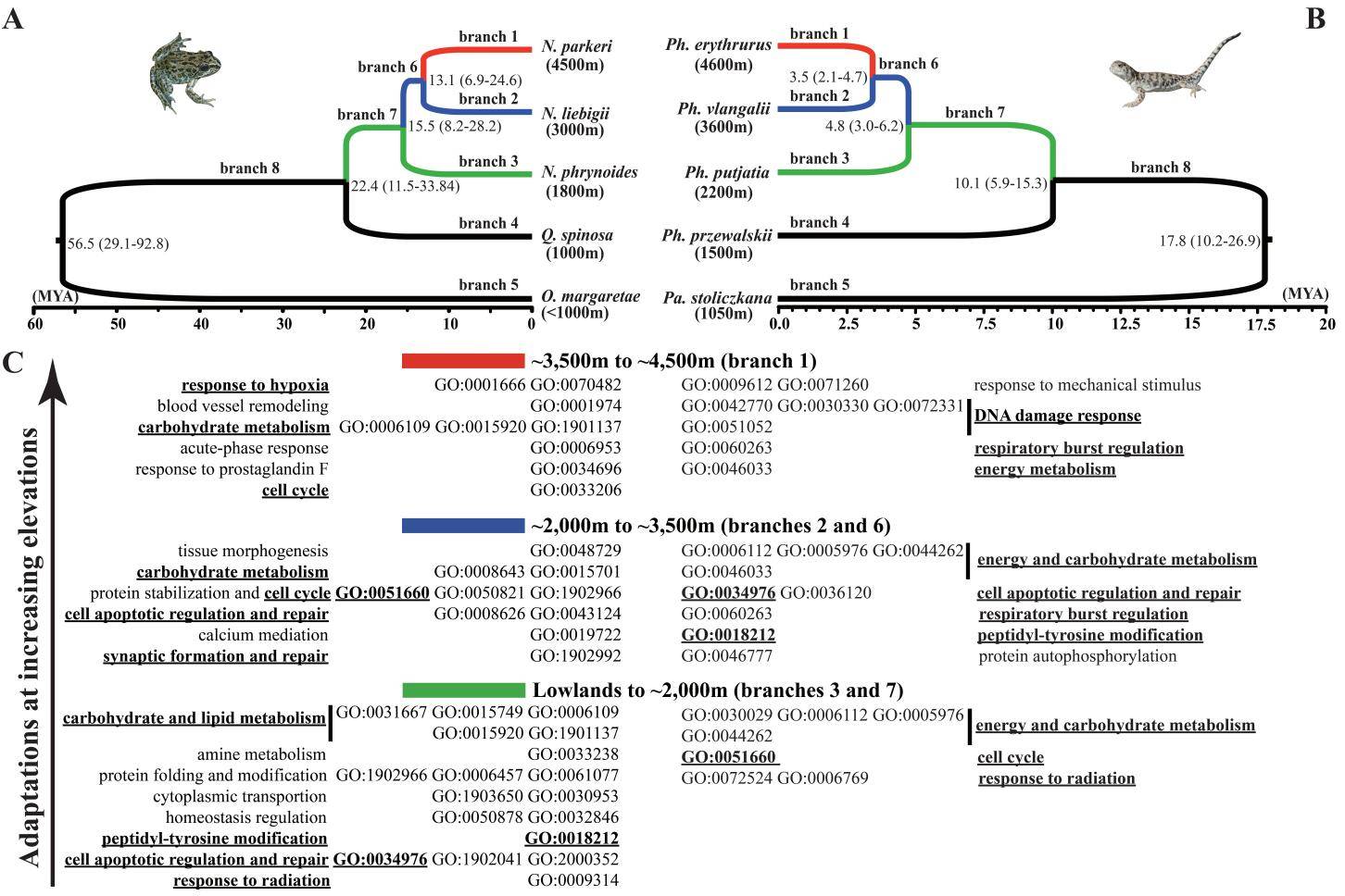 倭蛙属(左)和沙蜥属(右)的系统发育关系及各物种海拔分布,以及倭蛙属(左)和沙蜥属(右)发生低氧适应相关的功能举例(下划线标记为二者存在趋同)。