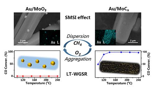 金属-载体强相互作用(Strong Metal-Support Interaction,SMSI)是多相催化中的一个重要概念,该效应常常会导致界面电荷转移、金属结构改变、分子吸附调变等现象,并最终强烈地影响到催化反应性能,关于SMSI效应的研究大都涉及金属/氧化物催化体系。过渡金属碳化物拥有类贵金属的电子性质,这赋予了它们非常独特的催化性能。在该工作中,研究人员从MoO3担载的Au纳米颗粒出发,通过碳化得到Au/MoCx催化剂。该催化剂中,Au呈现高分散态,Au与碳化物载体存在电荷转移,其低温水气变换反应活性优异,证实了Au与MoCx载体之间SMSI效应的存在。层状高分散的Au和聚集态的Au颗粒可以通过碳化和氧化处理相互转化,该工作首次报道了由循环的碳化-氧化处理引发的金属与碳化物载体之间动态SMSI效应。该研究中还利用原位表征技术XRD、XPS、XAFS等,探讨了Au在载体碳化处理过程中的分散机制,提出MoOxCy中间物种是分散Au的关键。