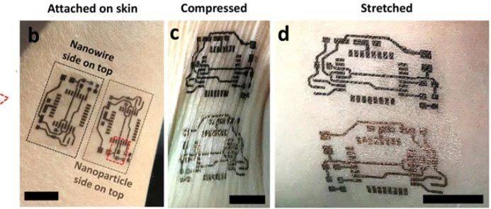 为解决上述问题,博士生郁哲、研究员尚杰和李润伟等采用液态金属作为导电填料,同时在导体内构建“葫芦串”状导电网络结构来释放应变,进一步提高它的应变稳定性。结果表明,该可拉伸导电材料的导电性能够达到导体范畴(大于1000S/cm),并可以实现超过1000%的拉伸,更为重要的是,拉伸100%时电阻的波动小于4%,比传统可拉伸导电材料电阻的变化率降低了2-3个量级,实现了可拉伸导体大应变下的稳定性。如图1a所示。该成果以底封面文章发表在Advanced Electronic Materials(Adv. Electron. Mater. 2018, 4, 1800137)上。进一步,采用上述可拉伸导电材料作为墨水,搭建了直写式打印机,实现了此材料在弹性基底上的直接打印和图案化设计,如图1b所示,设计打印出的弹性加热器件,具有良好的热稳定性。该项工作为柔性可穿戴电子器件制备提供了新的材料和技术。该成果发表在Advanced Materials Technologies(Adv. Mater. Technol. 2018, 3, 1800435)上。