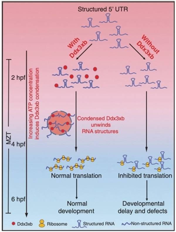 研究继续通过多组学分析发现RNA结合蛋白Elavl1a可能以一种RNA结构依赖性的机制进行母源mRNA稳定性的调控。Elavl1a iCLIP数据和icSHAPE数据联合分析显示Elavl1a倾向于结合单链RNA,体内/体外RNA pulldown、 凝胶阻滞实验(EMSA)也显示Elavl1a倾向于结合单链RNA。利用含有Elavl1a motif的不同结构探针的报告基因实验证明Elavl1a可通过结构依赖性的方式调控RNA稳定性。此外,基因功能实验显示Elavl1a缺失会导致斑马鱼胚胎发育缺陷,表明Elavl1a对早期发育具有重要作用。胚胎发育初期,Elavl1a结合并促进一些重要母源mRNA的稳定性,让这些母源因子能充分发挥作用;随着发育的进行,Elavl1a结合位点区域中RNA双链结构逐渐形成并抑制Elavl1a的结合,从而有利于这些母源mRNA的降解。
