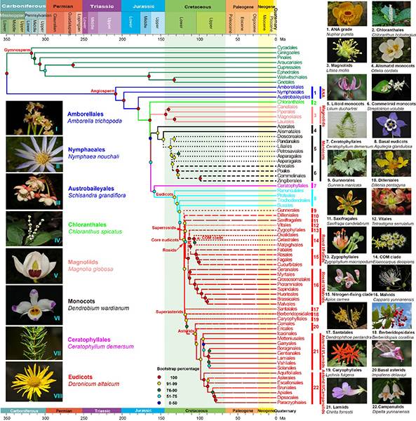 从植物的演变史看,25亿年前,地球上出现了菌类以及藻类植物。此后,地球植物进入了历时几十亿年的演变阶段,其中经过蕨类植物、石松类植物、真蕨类植物等,最后进入了被子植物时代。由此,地球植物真正进入了“有花”时代(以前的植物都没有花),被子植物也就成了植物界最高的进化阶段。特别是从新生代以来,它们在地球上占据了绝对优势的地位。这也决定了被子植物与我们有着密切的联系。首先,人类的大部分食物来自被子植物,如瓜果、蔬菜、谷物、豆类等;其次,被子植物是工业生产的重要原料,如造纸、塑料制品、食糖、医药等。此外,占植物界种数一半的被子植物每年还能向地球生物提供几百亿吨氧气,同时从空气中吸收同量的二氧化碳。正因为如此,被子植物的起源及其演化长期以来为人们所关注。100多年前,著名生物学家达尔文也开始了对这一问题的探讨。他发现,植物发展的最高阶段—被子植物早在距今约6500万年至1亿年前的白垩纪中晚期,发展就已经非常成熟了,但在白垩纪早期及此之前的侏罗纪地层里却没有发现被子植物的化石,而只有进化更早的裸子植物和蕨类植物的化石。于是,“被子植物的演变是否遵循进化论的规律”就成了达尔文心中的疑惑。如果遵循,就必须拿出证据来,达尔文虽做了大量的调查研究,但没有得到任何结果。如此令达尔文讨厌又难以解决,并对进化论理论形成挑战的谜题,就成了植物研究史上著名的“讨厌之谜”。破解这一难题也成为此后百年来无数生物学家、植物学家的追逐目标。