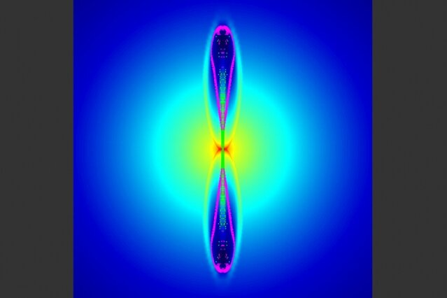 富钙超新星SN2019ehk的艺术概念图。外层为恒星爆炸前逃逸出的气体,中间层是爆炸中产生的富含钙的物质,当物质与超新星冲击波碰撞时产生明亮的X射线。图片来源:物理学家组织网