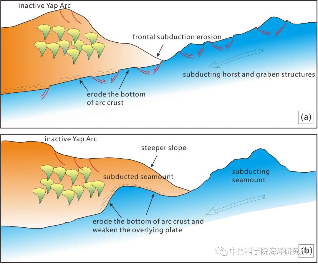 地震剖面揭示雅浦海沟内未发育明显沉积,俯冲的卡罗琳洋脊对构造地貌具有改造作用,并诱发俯冲侵蚀。俯冲侵蚀是俯冲系统内地壳物质从上覆板块剥离的地质过程,常伴有较高的板块汇聚速率。然而,雅浦俯冲带虽具有典型的俯冲侵蚀特征,如极短的沟弧间距(~40 km)、陡峭的弧前斜坡和沉积物缺失的海沟等,但是板块汇聚速率极低,因而具有重要的研究意义。研究团队通过地震剖面解释和地壳结构正演模拟等手段,首次详细揭示了雅浦俯冲带的俯冲侵蚀模型,认为该区域俯冲板块的粗糙程度与地壳厚度是控制上覆板块侵蚀过程的主要因素,俯冲板块内部海山与地垒地堑构造带的发育导致了俯冲过程中上覆板块的侵蚀。该模型为全球慢速汇聚的侵蚀陆缘研究提供了很好的实例。