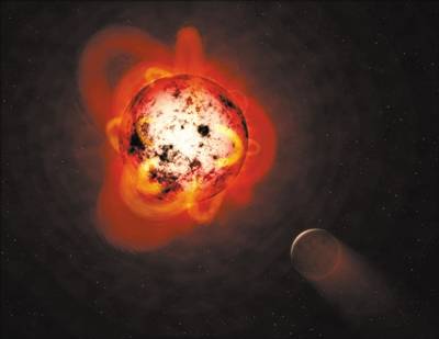 ▼一颗名为参宿四的红色超巨星引起了全世界科学家的兴趣,因为它在天空中莫名其妙地开始明显变暗。我们最近提到,科学家们相信他们现在已经知道是什么原因导致了它的变暗。理论上说,物质从恒星表面喷射出来,在太空中冷却,变成了尘埃,这阻挡了相当一部分光线到达地球。