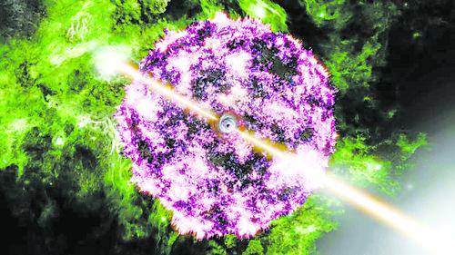 在超新星“SN2017iuk”爆发后不久,科学家对其的观测结果显示,它正在以三分之一光速的速度迅速膨胀——这是迄今为止人类所观测到的膨胀速度最快的超新星。通过对射流物质持续数周的监测,研究人员发现射流的化学成分在初始阶段和之后的不同时间点有着明显的差别。以上这些因素都是许多理论假设中的“热茧”包层真实存在的标志,这些结果增进了我们对恒星喷出的物质射流是如何与恒星周围的包裹层发生相互作用的认识,并在之前天文学界认为是截然不同的两种超新星之间架起了一座潜在关联的桥梁。这颗超新星标志着一颗大质量恒星的最终消亡:在这一过程中,恒星核心坍缩的同时,外包裹层被猛烈地吹离脱散。“SN2017iuk”属于一个极端的超新星类型——有时也被称为“超超新星”(hypernova)或“GRB-SN”——它会伴随产生一种更为剧烈的、被称为“伽马射线暴”(gamma-ray burst,简称GRB)的天文事件。所谓伽马暴,就是当某些恒星死亡时其两极能够喷射出一种极具相对论性的窄束物质流,这种物质流首先以伽玛辐射的形式发出明亮的光芒,然后其光芒的波长再逐渐变化,最后横跨过整个电磁波光谱。