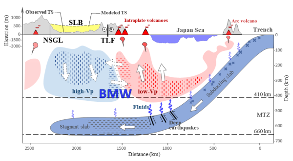 研究团队基于温度及化学成分对地幔间断面各种横向尺度起伏的不同控制作用,对间断面的成因及地幔对流模式开展研究。温度异常及化学成分异常均可造成大尺度(1000千米)和中等尺度(100千米)的地幔间断面起伏。但是,间断面的小尺度(10千米)起伏,难以利用温度异常解释,而是主要反映了化学成分的变化。学者们对地幔间断面的大中尺度起伏特征已经有了深入的认识,但是其小尺度起伏特征尚未见报道,也因此难以判定410/660千米间断面的成因。在大中尺度的间断面起伏研究中,P波、S波及其转换波或多次波等体波震相发挥了重要作用,但是由于这些体波的菲涅尔区较大,难以约束小尺度起伏特征。