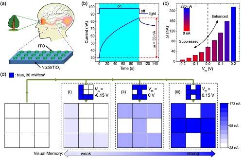 ITO/Nb:SrTiO3神经突触器件的(a)结构示意图、(b)基本光响应特性、(c)电调控光响应特性和(d)人类视觉记忆功能模拟应用