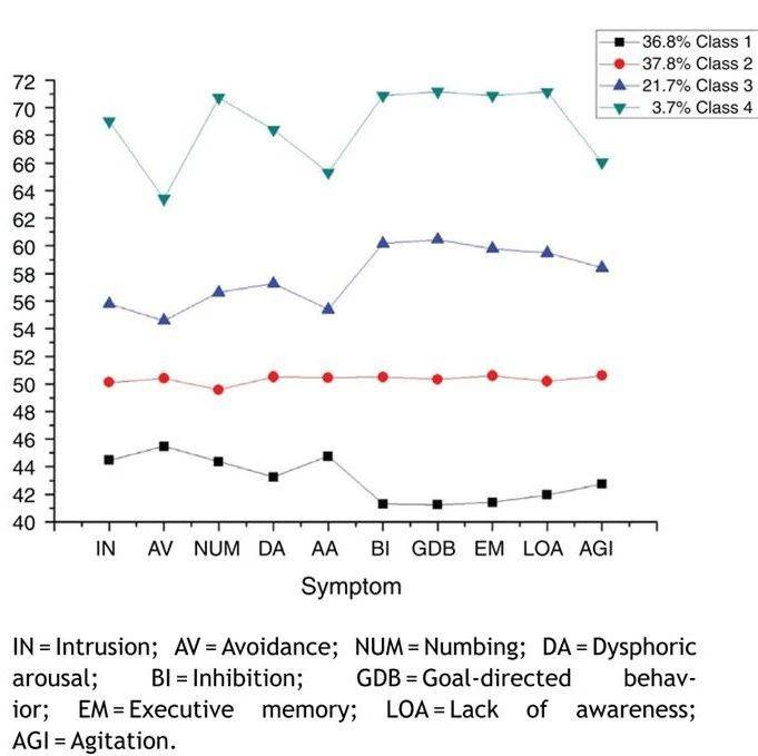 该研究揭示了PTSD的潜在症状维度网络结构。研究结果支持PTSD同时存在潜在的症状维度结构和症状维度间相互因果关联的网络结构,提示在未来研究中需要更加关注症状维度水平上而非单一症状水平上的动态交互。该结果也提示在PTSD的干预中需要更加关注特定症状维度间的关联,例如闯入与回避症状间的联结。