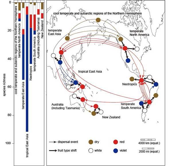 该研究利用系统发育学、进化生态学、生物地理学的综合方法,首次在一个单系类群中揭示了果实颜色的演化规律和生态功能分化,并将果实颜色对扩散、地理分布、物种分化速率三者的影响进行了量化,解析了该类群的环太平洋分布格局成因。同时,从果实颜色演化的角度,验证了由Wilson(1961)提出的“物种循环(taxon cycle)”假说,即物种分布区“扩张-收缩-新扩张”(expansion- contraction- shift)假说。这一假说认为,物种具有不同分工,一些负责拓殖到新的区域(扩张),一些负责就地物种分化(收缩),一段时间后再进行新一轮的拓殖(新扩张),形成了周期性的物种多样化动态过程,并最终决定了很多类群大尺度地理分布格局。然而,这一假说具有很大争议,虽然近年来物种循环在一些动物中被发现(如:加勒比海小安的列斯群岛的鸟类),但成因及驱动因素尚不明确。该研究从与扩散事件相关的果实颜色上,在植物类群上为物种循环这种大尺度地理分布格局的形成方式找到了关键证据。