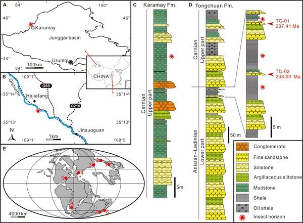 图.研究区及三叠纪–古近纪综合生物地层表
