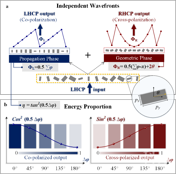 对于圆极化电磁波的极化调控来说,其极化通道可被分为两个同极化通道(co-polarized channels,即左旋圆极化入射-左旋圆极化出射、右旋圆极化入射-右旋圆极化出射),和两个交叉极化通道,(cross-polarized channels,即左旋圆极化入射-右旋圆极化出射、右旋圆极化入射-左旋圆极化出射)。在基于超表面结构的圆极化电磁波调控技术当中,几何相位超表面(geometric metasurface)是目前最直接且最简便的方法之一。然而根据Pancharatnam–Berry (PB) 相位原理可知,几何相位调控方案只能够在两个交叉极化通道中产生共轭对称的相位响应,无法对两个同极化通道产生任何的调控作用。根据相关成果报道,将传输相位因子引入在几何相位的调控方案中,可打破两种正交极化通道的共轭耦合性,实现两种独立的交叉极化出射波前。然而值得注意的是,虽然传输相位因子是通过产生同极化相位响应来对两个交叉极化通道进行解耦,但传输相位对入射波的圆极化状态并不具备选择性,仍然无法独立控制两条同极化传输通道。因此,如果能够实现对全部圆极化通道的独立利用和设计,这将在多功能集成、可重构器件及小型化系统设计等领域有着重大的意义。