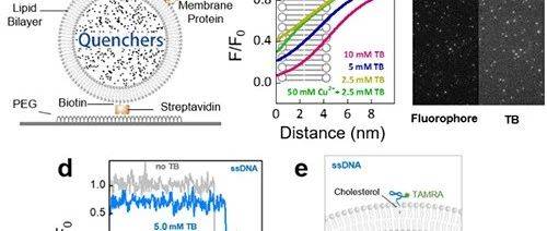 研究团队以单层脂质体中包裹的台盼蓝染料(TB)作为荧光受体,以膜蛋白上标记的荧光基团作为荧光供体。FRET效率随着标记位点与磷脂膜内表面距离的减小而逐渐升高,荧光的亮度也随之降低(图1)。结合理论计算,建立了膜蛋白特定位点的垂直位置与相对荧光亮度的对应关系,从而达到追踪该位点垂直位置变化的目的。研究人员首先利用标记了荧光的单链与双链DNA验证了原理的可行性。