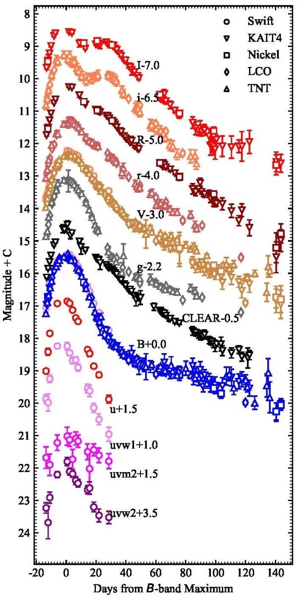 孟祥存介绍,Ia型超新星是光谱中没有氢线、氦线,但是有很强的硅线的一类特殊超新星。Ia型超新星不管距离我们远还是近,其爆发实际亮度都是一样的,这样一来我们就可以通过观测Ia型超新星来测量其所在星系的距离——看上去比较亮的就距离近,比较暗的就距离远。这类超新星在经过光变曲线的校准以后,可以作为标准烛光来测距,也因此成了天文学家手中的一把量天尺。