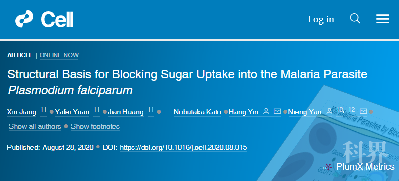 图1 青蒿素及ACT疗法在东南亚(左图)和非洲(右图)地区出现治疗失败(图片来源:左图,WHO world malaria report;右图,Nature Medicine, 2020, https://doi.org/10.1038/s41591-020-1005-2)葡萄糖是大多数动物细胞的主要能源物质,通过抑制细胞摄取葡萄糖的“饥饿疗法”,可作为治疗一些相关疾病的潜在治疗策略。在恶性疟原虫中,己糖转运蛋白PfHT1(Plasmodium falciparum hexose transporter 1)是其主要的葡萄糖摄入蛋白,通过抑制该蛋白的转运活性,将可能有效抑制疟原虫的能量摄入从而抑制原虫的生长和增殖,但是该策略的难度在于定向抑制疟原虫的糖摄入而不影响人体细胞。在早期针对PfHT1作为抗疟靶点的研究中,由于缺乏该蛋白的结构信息,抑制剂的开发工作没有取得突破性进步。早在2014和2015年,当时任清华大学教授的颜宁团队相继解析了人源葡萄糖转运蛋白GLUT1和GLUT3的高分辨率晶体结构(2014,2015,Nature),与此同时将目标锁定PfHT1,并在结构解析的基础上与清华大学药学院尹航教授团队合作进行基于结构的小分子药物开发。 2020年8月28日,颜宁团队与尹航团队合作在Cell上在线发表题为Structural Basis for Blocking Sugar Uptake into the Malaria Parasite Plasmodium falciparum(抑制恶性疟原虫糖摄入的结构基础)的重要研究成果。