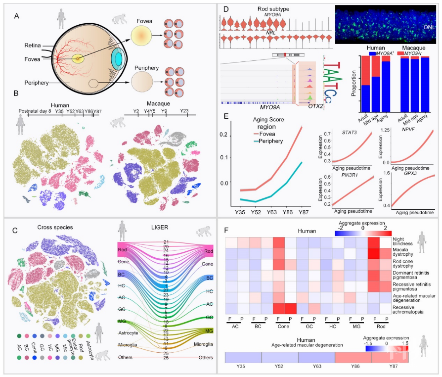 视觉是人和动物最重要的感知觉,至少有80%的外界信息经由视觉系统接收、处理和感知。光线作用于视网膜中的感光细胞,这些细胞将光信号转换为电信号,经过多级神经元传递,最后视觉信号通过视神经传输到大脑中,使得人和动物能够感知外界物体的大小、明暗、颜色、动静,对机体生存至关重要。然而,随着年龄增长,视网膜功能会逐渐发生退化,同时各种年龄相关性视网膜疾病风险也相应增加。因此,了解视网膜衰老进程中细胞组成及其内在基因调控网络变化对治疗和预防年龄性相关视网膜疾病有着不可忽视的推动作用。在人类及非人灵长类视网膜中存在一个特化的区域,称为黄斑区,主要负责明视觉以及色觉。很多衰老相关的眼疾都具有黄斑区特异性。由于小鼠等低等模式动物视网膜缺乏黄斑区,故而研究人类及非人灵长类动物视网膜衰老的分子机制,对治疗年龄相关性视网膜病变十分重要。