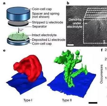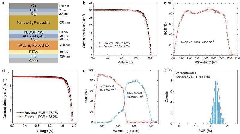 图(a)为柔性电池照片;图(b)为器件断面TEM照片;图(c)为电池性能J-V曲线;图(d)为器件弯曲耐久性测试结果;图(e)为器件疲劳测试结果;图(f)为湿热测试结(85 °C,85% RH)