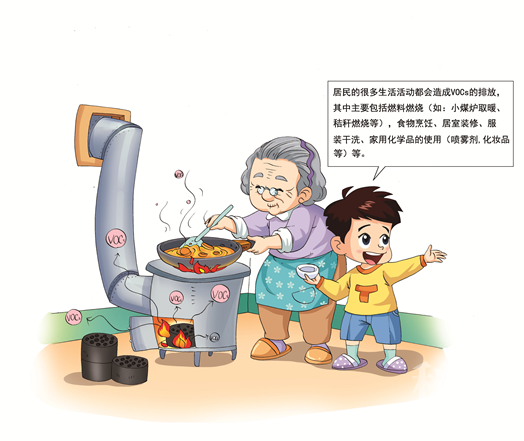 居民的很多生活活动都会造成VOCs的排放,其中主要包括燃料燃烧(如:小煤炉取暖、秸秆燃烧等),食物烹饪、居室装修、服装干洗、家用化学品的使用(喷雾剂,化妆品等)等。这些生活活动虽然都会造成VOCs的排放,但其产生机制并不相同,如燃料燃烧过程排放的VOCs是燃烧生成的,而装修过程排放的VOCs是建筑涂料或胶黏剂等使用过程中溶剂挥发造成的。