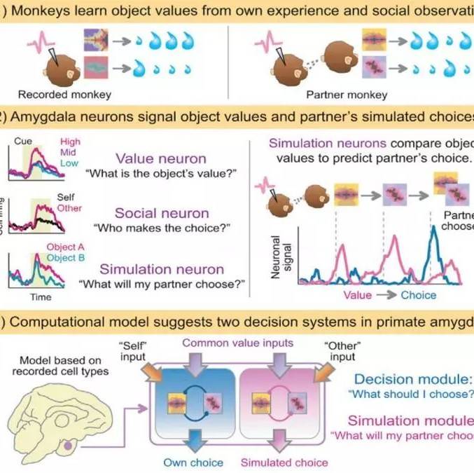 2019年4月11日,Cell 发表了题为Primate Amygdala Neurons Simulate Decision Processes of Social Partners 的研究。该项工作由剑桥大学的灵长类神经生物学家Fabian Grabenhorst实验室独立完成。他们描述了分布于杏仁核(amygdala)多个亚区的四类独特的神经元,它们不仅能从自身经历、还能通过观察同伴的经验来推算出物品价值(object value),模拟同伴的决策过程(decision process)并准确预测同伴的最终选择。这些杏仁核神经元组成的神经环路,可能是让灵长类拥有理解和预测社会伙伴(social partner)的决策和精神状态的关键。