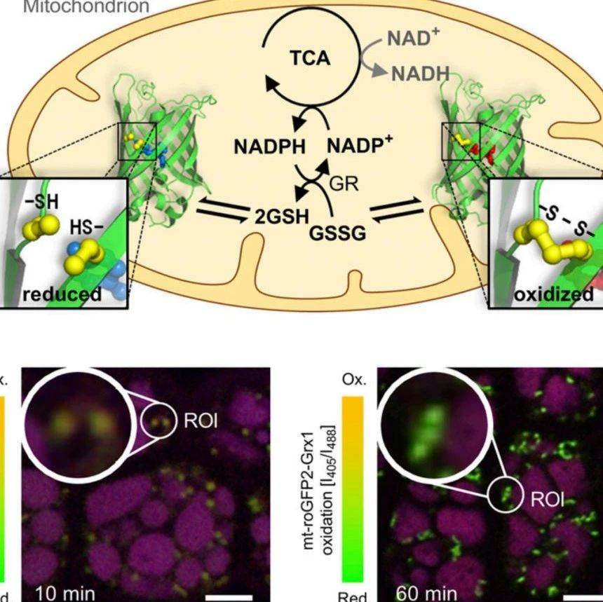 图2.(A)TTP对纯化TrxR蛋白的抑制,(B)TTP对细胞和线粒体TrxR蛋白的抑制,(C)TTP对线粒体形貌的影响,(D)TTP对线粒体能量代谢的影响。
