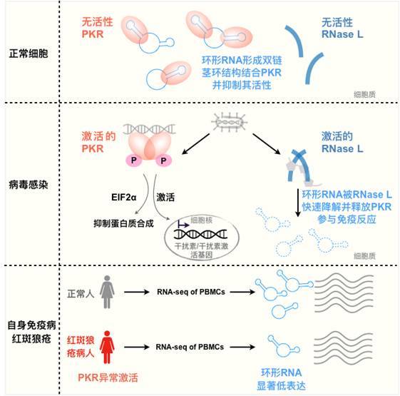 在这项最新的研究中,科研人员首次发现环形RNA在细胞受病毒感染时被核糖核酸酶RNase L降解的过程,并解析了环形RNA形成16-26 bp的双链RNA茎环结构,并以此为基础结合天然免疫因子PKR的特性。深入研究发现,在正常细胞状态下,环形RNA通过结合PKR并抑制其活性,避免了PKR过度激活引起免疫反应;而当细胞被病毒感染时,环形RNA被RNase L快速降解进而释放PKR参与细胞的天然免疫炎症反应。进一步通过对系统性红斑狼疮病人来源的外周血单核细胞分析表明,在病人体内环形RNA普遍低表达且PKR异常激活;而增加环形RNA则可以显著抑制病人来源外周血单核细胞和T细胞中的PKR及其下游免疫信号通路的过度激活。这些发现不仅首次揭示了环形RNA的降解途径及其特殊二级结构特征,并发现环形RNA发挥天然免疫炎症反应调控的全新功能。相关研究进展为环形RNA代谢和功能研究奠定了重要基础,也为炎症性自身免疫病系统性红斑狼疮的发病机制提出了环形RNA参与的新型机制。