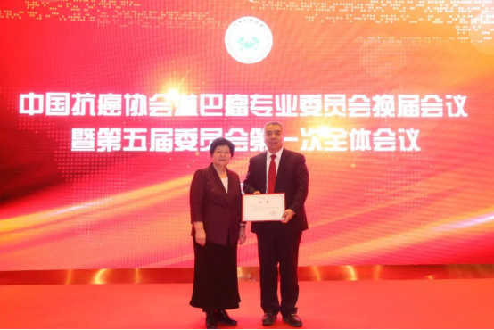 中国抗癌协会王瑛秘书长为石远凯主任委员颁发证书