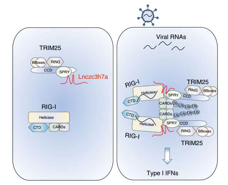 针对TRIM25如何调控RIG-I激活抗病毒天然免疫的问题,曹雪涛与浙江大学医学院免疫所博士生林虹羽以及中国医学科学院免疫治疗研究中心教授姜明红等协同攻关,找到了能够结合TRIM25并能显著调控RIG-I天然免疫信号通路的lncRNA。通过对初步得到的20条lncRNA进行功能筛选,研究人员发现其中一种lncRNA能分别直接结合TRIM25和活化型RIG-I,并将此lncRNA命名为Lnczc3h7a。