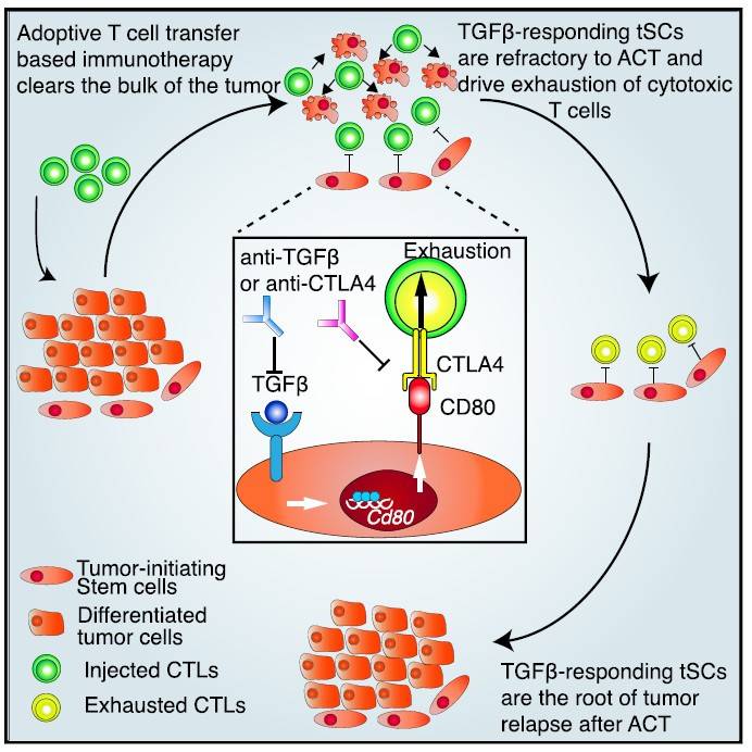 导语:将tSCs置于如何激活免疫检查点通路的关键时刻。来源:梅斯医学我们的身体配备了强大的免疫监视功能,可以清除癌细胞。至今为止,我们对于形成和传播癌症的肿瘤起始干细胞(tSCs)如何装备自己,克服这一障碍仍然知之甚少。为了解决这个问题,研究人员设计了一种鳞状细胞癌(SCC)的皮肤癌模型,可以通过基于过继细胞毒性T细胞转移(ACT)的免疫疗法进行有效的挑战。利用单细胞RNA测序(RNA-seq)和谱系示踪,研究人员发现转化生长因子β(TGF-β)响应的tSCs在抗ACT方面具有优势,是肿瘤复发的根源。进一步探测机制的时候,研究人员发现,在恶性肿瘤期间,tSCs选择性地获得CD80,这是一种先前在免疫细胞上发现的表面配体。此外,在接触细胞毒性T淋巴细胞抗原-4(CTLA4)后,表达CD80的tSC直接抑制细胞毒性T细胞活性。相反,在CTLA4-或TGF-β阻断免疫疗法或Cd80消融后,tSC变得脆弱,在ACT治疗后肿瘤复发减少。该研究结果将tSCs置于如何激活免疫检查点通路的关键时刻。原始出处:Miao Y et al. Adaptive Immune Resistance Emerges from Tumor-Initiating Stem Cells. CELL, 2019; doi: 10.1016/j.cell.2019.03.025.本文系梅斯医学(MedSci)来源:MedSci_cn MedSci梅斯