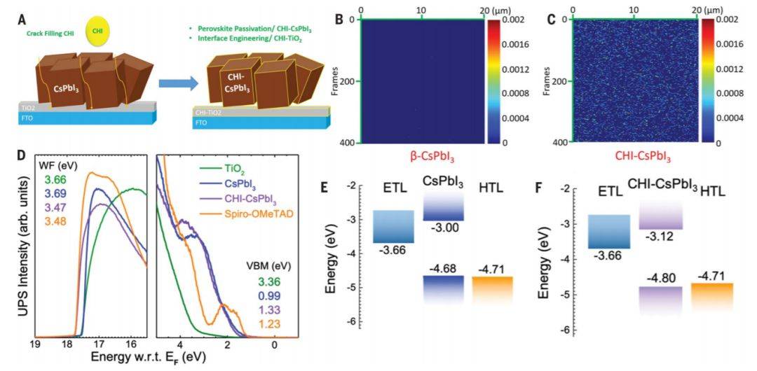无机CsPbI3材料因其高热稳定性、化学稳定性,以及优异的光电性能,在太阳电池领域具有广阔的应用前景。但是由于CsPbI3薄膜界面与本体的载流子复合会导致能量损失,从而限制该类太阳电池光电性能的提升。此外,CsPbI3电池对水汽敏感性是该材料商业化应用的又一技术瓶颈。