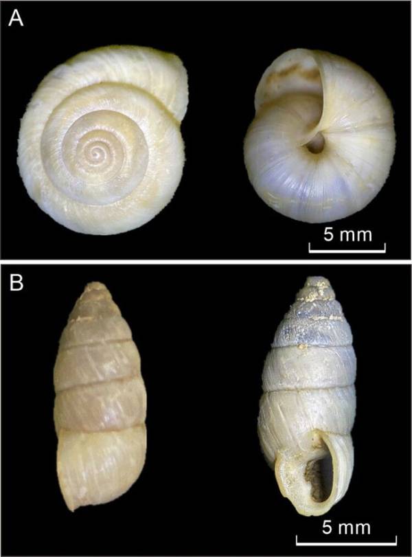 图1.蜗牛壳体照片.A. 红山华蜗牛; B. 奇异螺