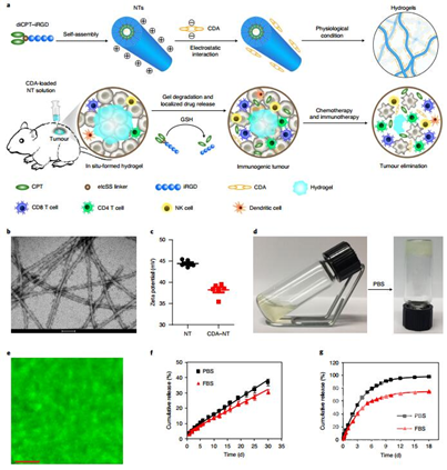实验结果表明,由于对肿瘤弱酸性微环境及较高浓度的基质金属蛋白酶高度敏感,这一新型水凝胶在包载化疗药物阿霉素后注入肿瘤组织,可实现肿瘤局部长效的药物释放。同时,其纳米组成单元中类黑色素聚多巴胺粒子的存在,使该材料可同时实现近红外激光介导的热促药物释放及肿瘤的热化疗协同治疗,提高肿瘤的治疗效率。