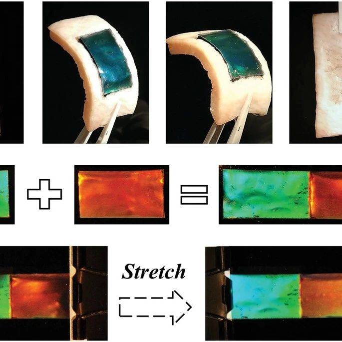 得益于小应变范围下的优秀变色能力,研究人员提出并展示了一种低应变区间下的高灵敏度可视化应变测量方法。将所制备的柔性光子晶体与碳纳米管复合材料(CNTs/PDMS composites)相结合制备了可视化应变测量器件,该器件能够通过颜色对30%以下低应变区中四种应变范围进行区分显示。得益于小变形量的敏感性,该传感器为低应变区间下的可视化应变测量提供了一种技术方法,使其在拉伸应变的可视化监控方面具有很好的应用前景。