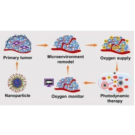 近年来,分级光动力疗法(fPDT)被开发出来用于来进一步提高治疗的安全性和有效性,分级光动力疗法类似于临床分级放射疗法,在肿瘤区域中进行明暗间隔的多次照明以达到更好的治疗效果。不幸的是,由于肿瘤血管的缺乏和组织结构的异常,大多数肿瘤是乏氧的,而PDT可以进一步降低肿瘤部位的氧气浓度。在fPDT中,在进行第一次PDT后,肿瘤脉管系统可能会受到严重损伤或破坏,从而在随后的组分中很难使肿瘤部位再氧化,这极大地限制了fPDT的抗肿瘤效率。