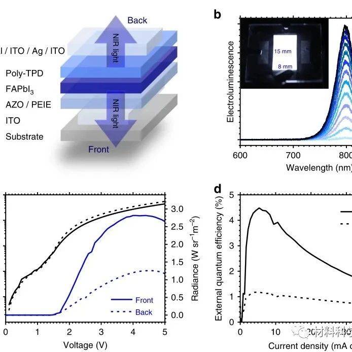 近日,浙江大学皮孝东教授等人在Science China Materials上发表研究论文,利用聚3-己基噻吩(P3HT)空穴迁移率高和对近红外光没有吸收的特点,将其作为器件的空穴传输层以提高近红外发光二极管的性能。实验发现,P3HT改善了基于硅量子点的近红外发光二极管的空穴/电子传输不平衡的现象。