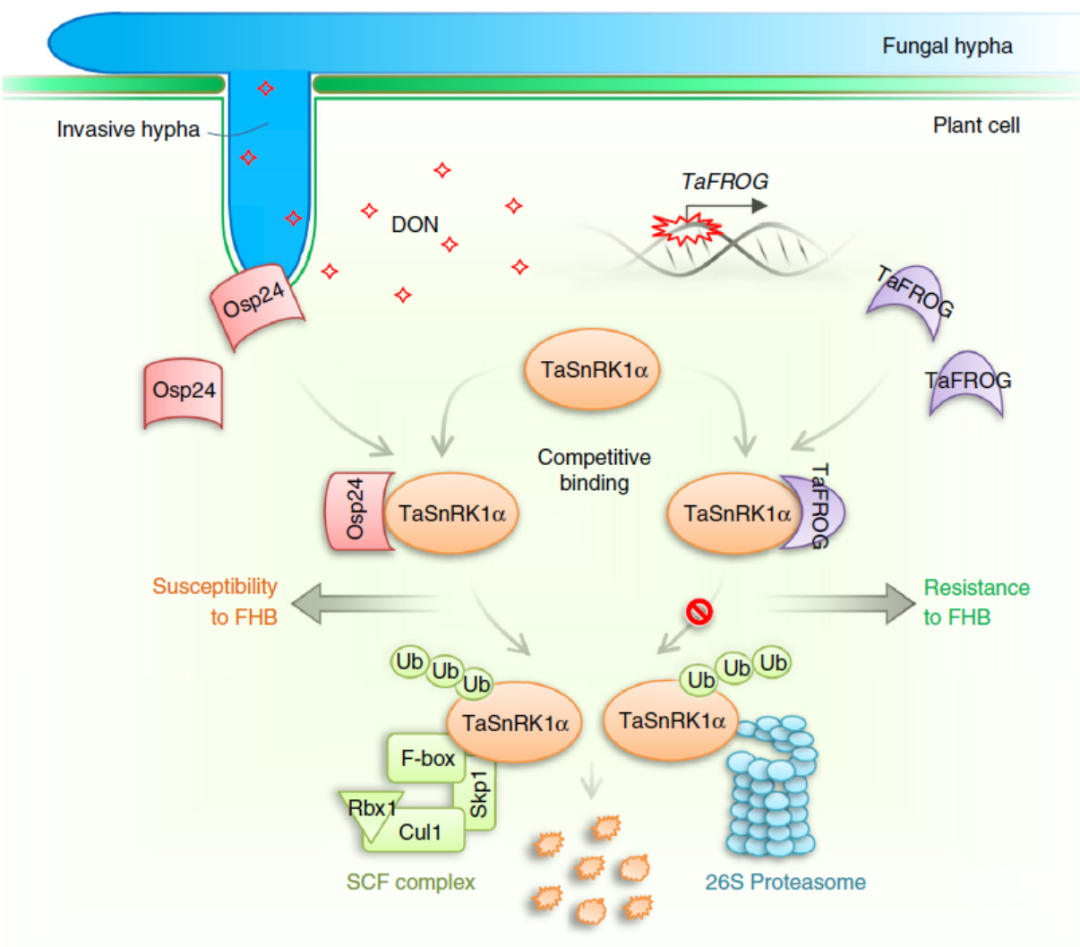 主要由禾谷镰刀菌引起的镰刀菌赤霉病(FHB)是全球小麦生产面临的最严重的疾病之一。由于复杂的抗性机制和缺乏对该疾病免疫的种质,育种者已经尝试开发抗FHB的栽培种,尽管不是很成功。全球数以千计的种质资源调查,WSB和苏麦3号(S3;苏州地区农业科学研究所培育,与WSB位于同一地区)起源于两个具有强FHB抗性的种质,与谱系无关。数量性状基因座(QTL)作图显示,两个种质都在3BS染色体上携带一个主效QTL,赋予花序或穗内FHB扩散抗性。该S3 QTL命名为Fhb1。最近,提出编码具有凝集素结构域的嵌合凝集素和Fhb1区间中的成孔毒素样结构域(PFT)的基因是Fhb1赋予的FHB抗性的原因。
