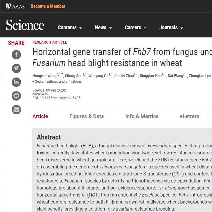 原标题:Nature Genetics | 开年第一篇,南京农业大学马正强团队发现小麦抗赤霉病关键作用位点主要由禾谷镰刀菌引起的镰刀菌赤霉病(FHB)是全球小麦生产面临的最严重的疾病之一。由于复杂的抗性机制和缺乏对该疾病免疫的种质,育种者已经尝试开发抗FHB的栽培种,尽管不是很成功。全球数以千计的种质资源调查,WSB和苏麦3号(S3;苏州地区农业科学研究所培育,与WSB位于同一地区)起源于两个具有强FHB抗性的种质,与谱系无关。数量性状基因座(QTL)作图显示,两个种质都在3BS染色体上携带一个主效QTL,赋予花序或穗内FHB扩散抗性。该S3 QTL命名为Fhb1。最近,提出编码具有凝集素结构域的嵌合凝集素和Fhb1区间中的成孔毒素样结构域(PFT)的基因是Fhb1赋予的FHB抗性的原因。