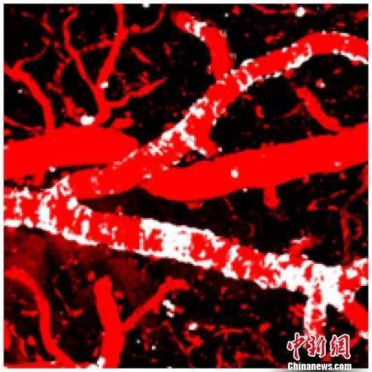 ▲活体小鼠双光子显微镜发现阿尔茨海默病引起大脑毛细血管β淀粉样蛋白的大量沉积,表明血管因素在阿尔茨海默病病理进程中的重要作用。校方供图