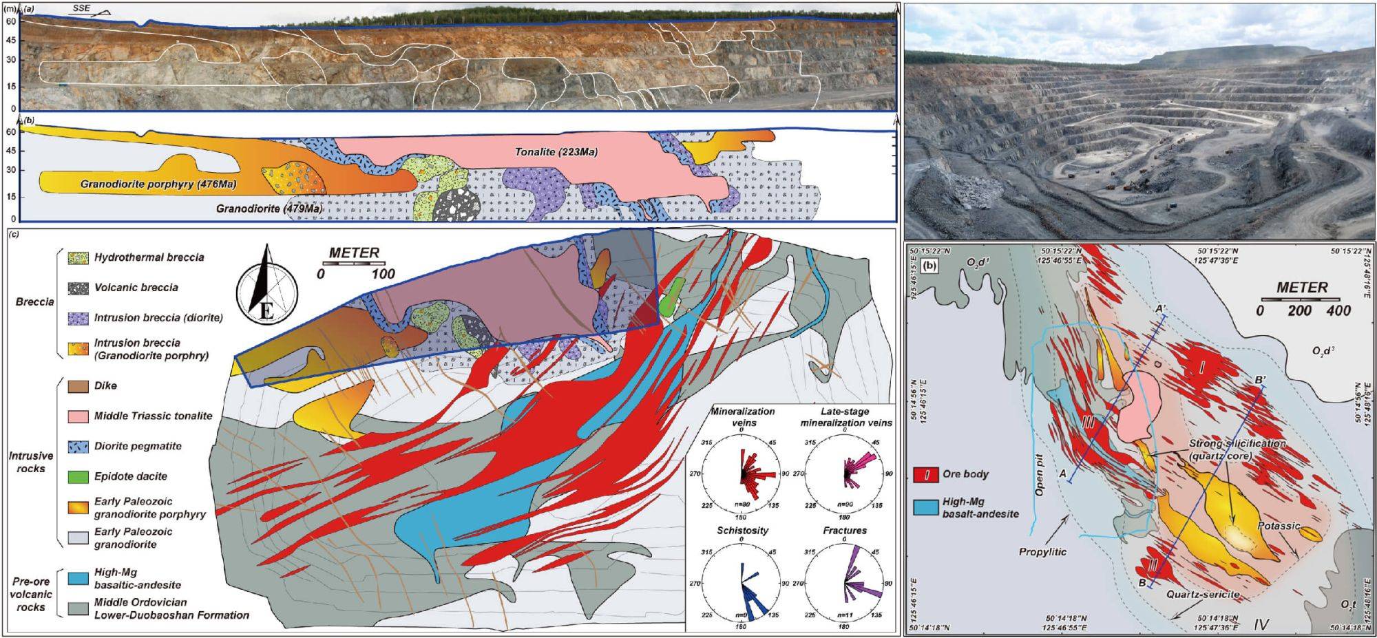 北方造山带东部自早古生代以来经历了古亚洲洋、蒙古-鄂霍茨克洋、古太平洋三大构造体制的复合造山及成矿作用,但不同构造体制间复合叠加的表现形式、时空关系、构造体制的转换时限及其与成矿作用间的耦合关系尚不明确。基于这一科学问题,在国家重点研发计划项目“北方东部复合造山成矿系统深部结构与成矿过程”的支持下,中国科学院地质与地球物理研究所矿产资源研究重点实验室博士生赵超与导师秦克章及合作者,对中亚造山带东段最古老的黑龙江多宝山斑岩铜矿床的岩浆过程进行了系统的研究。在扎实的采坑地质填图基础上(图1),他们识别出多宝山斑岩铜矿发育4期岩浆作用:成矿前高镁玄武岩-安山岩组合,近成矿花岗闪长岩及花岗闪长斑岩,成矿后玄武安山岩,以及中生代英云闪长岩。