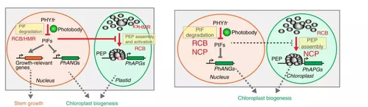 NCP(UCLEAR CONTROL OF PEP ACTIVITY),经遗传分析也位于PHY下游,参与光诱导的下胚轴抑制和叶绿体合成。这也是一个核-质体双定位蛋白,特别的是,作者通过蛋白质大小分析发现,NCP 可能是先被定位到质体,随后才转移至核内的。与RCB类似,NCP参与调控光小体的形成和PIFs的降解,也诱导PEP的装配和PhAPG的转录;不同于RCB的是, NCP除在核里介导PIFs的降解外,还在质体里直接促进PEP复合体的组装,敲除PIFs不能互补ncp突变体中PEP复合体的缺陷。