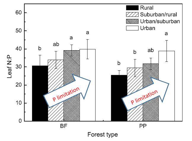 阔叶林和马尾松林叶片N:P对城市化梯度的响应