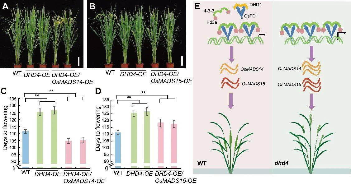 小穗是禾本科植物花序结构的独特结构单位,其正常发育是决定产量和品质的重要因素。对水稻小穗发育分子调控机理的研究具有重要的理论价值和现实意义。该团队以水稻小穗发育畸形突变体为材料,通过图位克隆的方法鉴定了一个编码过氧化物酶体受体蛋白基因 OsPEX5 。OsPEX5蛋白可以与茉莉酸(JA)生物合成途径的12-氧-植物二烯酸还原酶发生互作并影响其过氧化物酶体定位,造成突变体中茉莉酸含量下降,且通过外源甲基茉莉酸(MeJA)处理可以部分恢复其小穗异常的表型。进一步研究还发现,水稻茉莉酸信号途径中的正向调控因子可以结合到花发育关键基因的启动子上并激活它们的表达,并且这种激活作用会被JA信号途径中的负调控因子所拮抗。该研究完善了茉莉酸调节植物生殖发育的分子机制,并为调控植物中茉莉酸的生物合成提供了重要的理论基础。