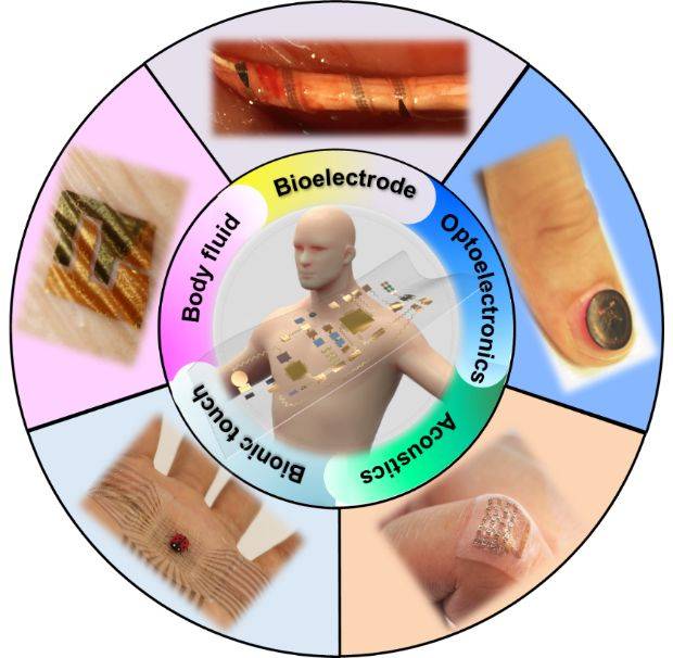 图1. 用于生理参数监测的柔性混合电子:柔性生理电器件、柔性光电器件、柔性声学器件、柔性类皮肤功能器件和柔性生化检测器件