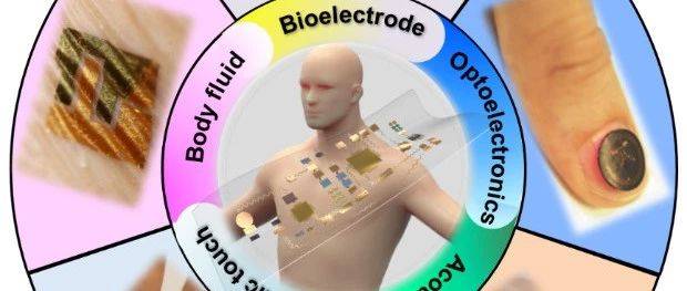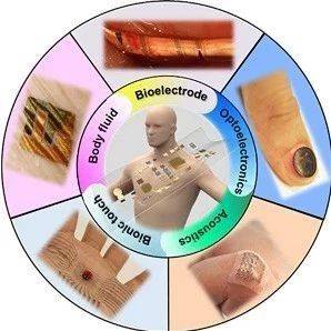 图1. 用于生理参数监测的柔性混合电子:柔性生理电器件、柔性光电器件、柔性声学器件、柔性类皮肤功能器件和柔性生化检测器件