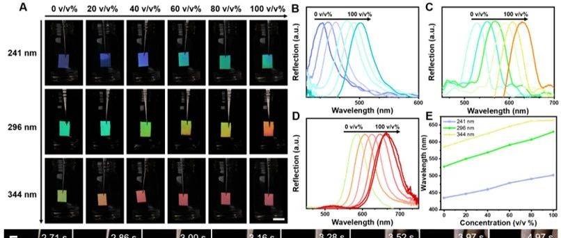 据介绍,该薄膜在溶剂氛围中的颜色变化速度可快至0.2秒,并且通过调控薄膜暴露在溶剂蒸气中的时间长短,实现不同的颜色变化。此外,该薄膜还能响应不同的溶剂,在乙醇、丙酮、氯仿等溶剂蒸汽中产生相应的颜色变化,这种通过特定化学或生物分子等刺激实现变色的技术,未来有望应用于身体健康检查及环境污染监测领域等。