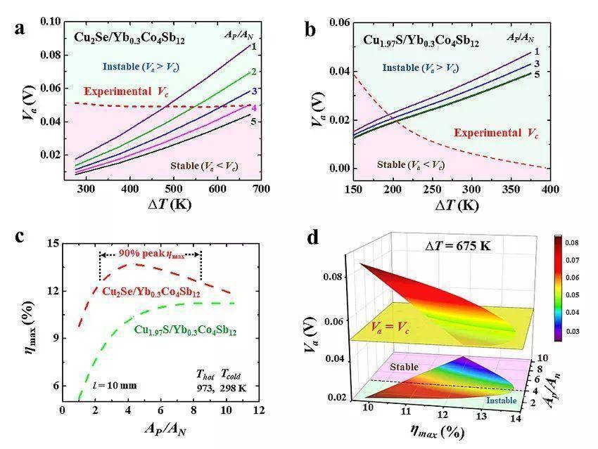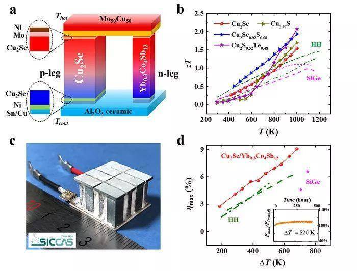 先进热电转换技术在半导体制冷、工业余热和汽车尾气废热发电等领域具有广泛的应用前景。长期以来,热电材料的研究主要集中于晶态化合物。2012年中国科学院上海硅酸盐研究所热电团队通过在固态材料中引入具有“类液态”特征的离子以弱化甚至消减部分横波声子振动模式 (Nat. Mater., 2012),发现了一大类具有“声子液体-电子晶体”特征的新型高性能类液态热电材料体系。上硅所热电团队进一步研究和解析了类液态材料中可移动离子在外场作用下的迁移和析出机理,提出了材料能否稳定使用的热力学判据 (Nat. Commun., 2012)。高性能热电材料是先进热电转换技术的前提和基础,而高效热电器件则是其走向应用的核心和关键。对传统热电材料而言,器件的开发和研究通常仅需通过结构尺寸和界面的设计与优化来实现最大能量转换效率/最大输出功率等。然而,对类液态材料而言,可移动的类液态离子对热电器件的服役稳定性提出了新的挑战,器件的设计和集成制造还必须对服役稳定性进行针对性的优化以同时获得高能量转换效率/输出功率和服役稳定性。最近,中国科学院上海硅酸盐研究所史迅研究员、陈立东研究员、仇鹏飞副研究员与美国西北大学G. Jeffrey Snyder教授合作,超越了传统热电器件的设计思路与方案,提出了基于类液态材料的热电器件设计新准则,即通过器件结构尺寸和界面的优化同时实现高能量转换效率和服役稳定性,并成功将该准则应用于Cu2Se和Cu1.97S类液态材料热电器件的研制,获得了兼具高能量转换效率(9.1%)和高服役稳定性的新型热电器件。