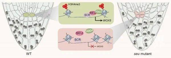 该研究发现,seu突变体中WOX5表达显著下降;且该突变体与wox5突变体呈现类似的干细胞发育缺陷。深入研究发现, SEU作用于SHR/SCR通路正向调控WOX5表达和干细胞组织中心的建立。SEU通过与转录因子SCR直接互作而被招募到WOX5启动子;然后,SEU通过直接互作招募组蛋白甲基转移酶SDG4至WOX5启动子并诱导组蛋白H3第4位赖氨酸的三甲基化(H3K4me3),进而激活WOX5表达。