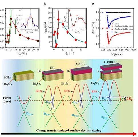 图2. (a) 阻尼因子和自旋混合电导(Inset)随Bi层厚度的变化关系。(b)Spin-charge转化效率和IEE响应电压(Inset)随Bi厚度的变化。(c)对于TISS、RSS以及共存态,其平均自旋极化势和费米面移动之间的关系。底图:各个表面态演化和费米面的位置随着Bi层厚度的关系。